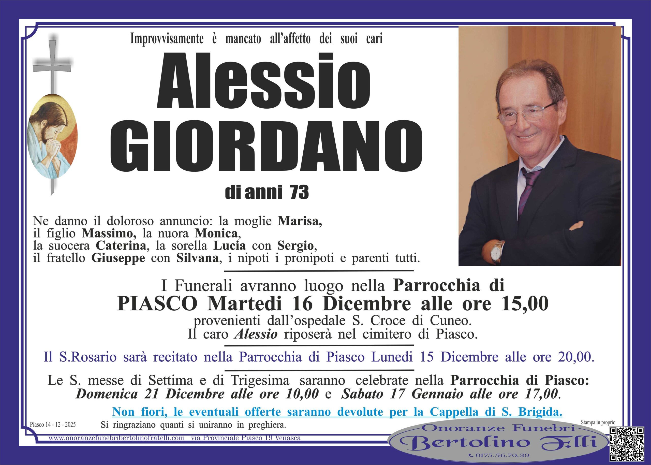 Giordano Alessio Invia il tuo messaggio di cordoglio Questo sito è protetto da reCAPTCHA e dalla Privacy Policy di Google, che applica questi Termini di utilizzo. Ho letto e accetto le condizioni della privacy (OBBLIGATORIO)